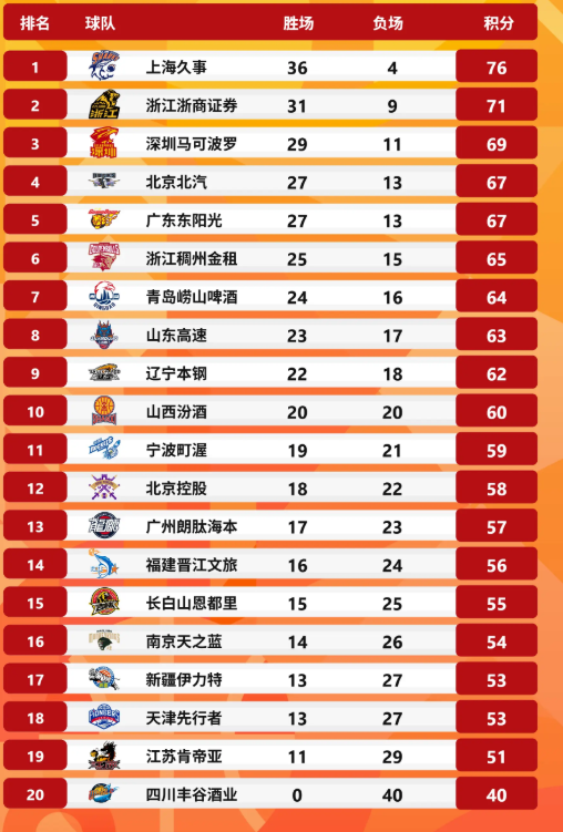 CBA积分榜:北京首钢力压广东 深圳手握主动权