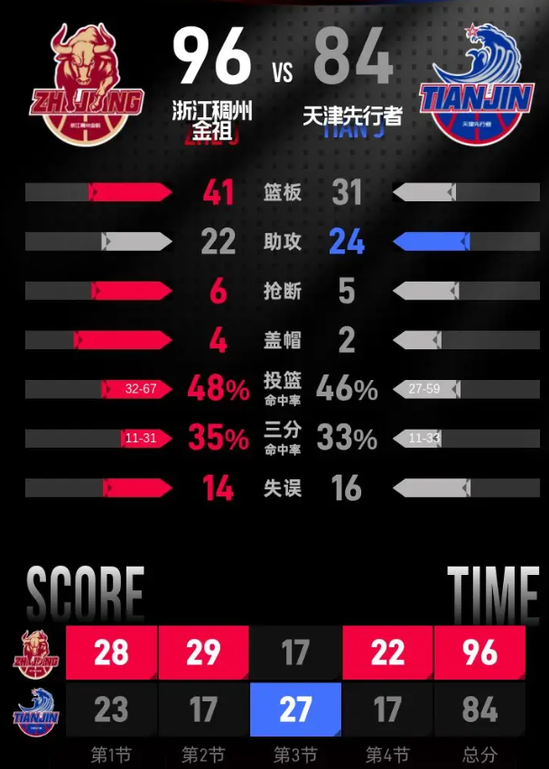 比赛进入末节争夺,天津延续追分势头,林庭谦命中三分,哈姆雷特接连上篮得分,何思雨跳投命中后,分差缩小到5分。安德鲁斯上篮得手再投进三分重新拉开分差,程帅澎多次站上罚球线得分,再接助攻命中三分,把优势重新拉回到两位数。田雨命中三分再跟进上篮,帮助天津把分差维持在10分上下。最后一分钟约翰逊接程帅澎助攻上篮得分,最终浙江稠州金租在主场以96-84击败天津先行者。