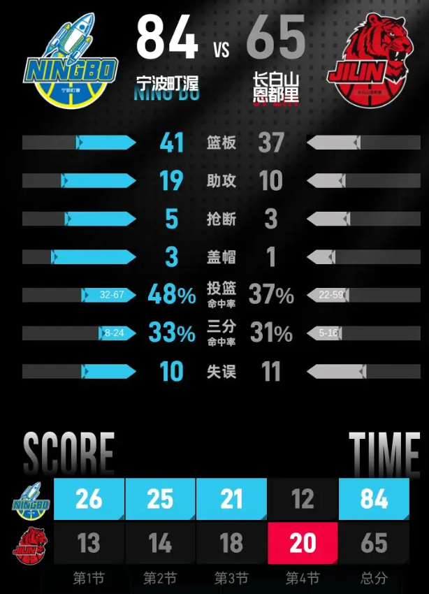 宁波町渥队:富兰克林·杰克逊23分6篮板2助攻、扎维尔·辛普森13分9篮板10助攻、宁鸿宇10分5篮板、塔克·法尔8分6篮板、刘晓宇8分1篮板、俞长栋7分3篮板、罗凯文5分5篮板1助攻、王俊杰4分1篮板3助攻、鲁吐布拉2分3篮板3助攻、赵建树2分2篮板、许裕茁2分。