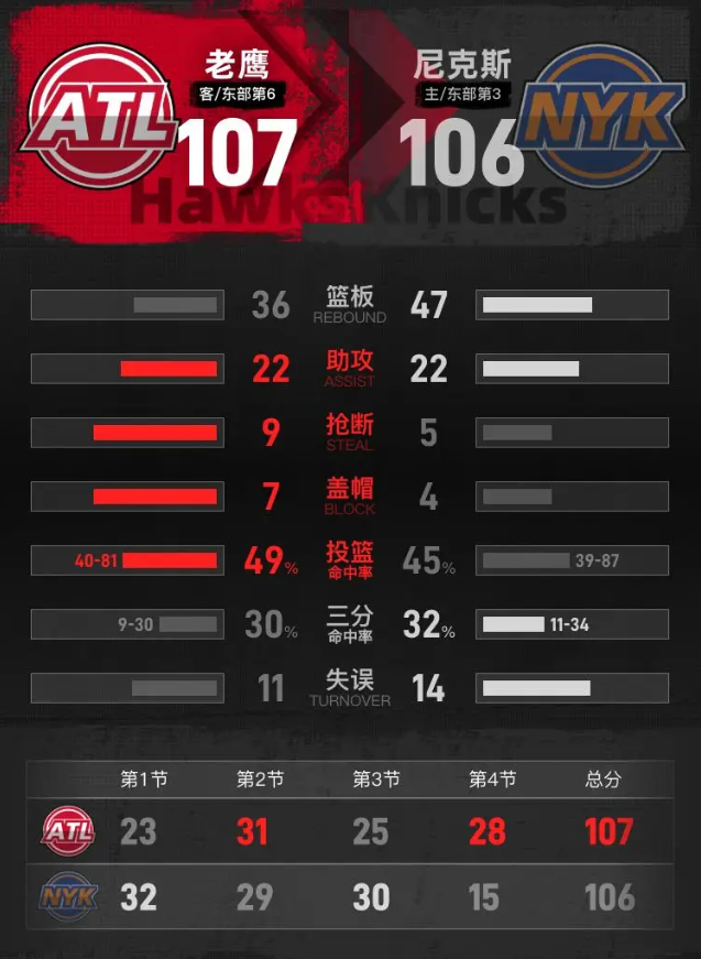 时间:2026-04-21 11:26:08北京时间4月21日NBA季后赛,客场作战的老鹰以107-106击败尼克斯,将总比分扳成1-1平。麦科勒姆32分3篮板6助攻,哈特15分13篮板6助攻。