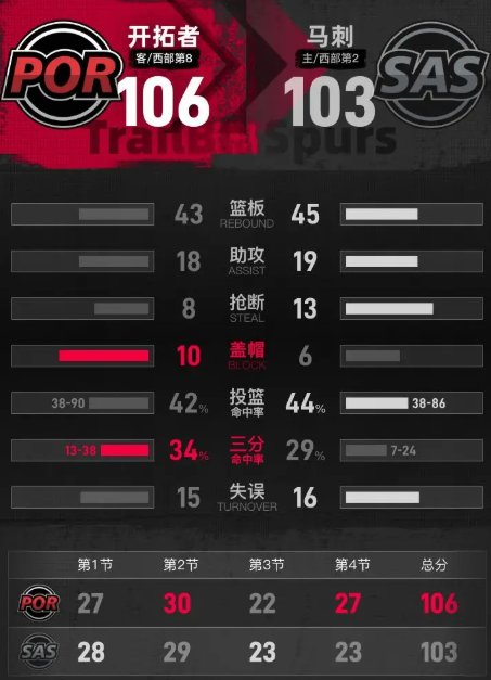 全场具体比分(马刺队在后):27-28、30-29、22-23、27-23。