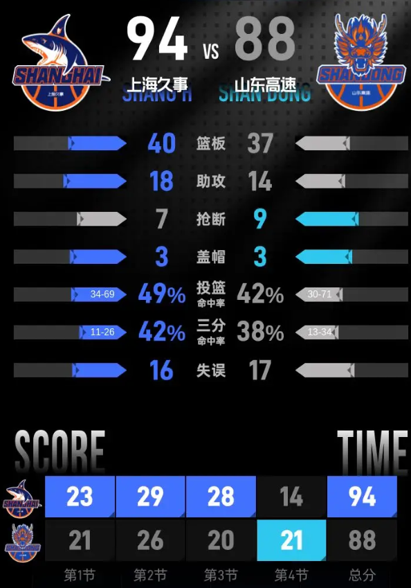 比赛进入末节,约翰逊开局命中三分,随后不断取分帮助山东缩小分差,王证接到助攻命中三分,分差缩小到只剩4分。古德温上篮得手稳住局势,终场前31秒闫鹏飞上篮得分,分差回到8分。约翰逊迅速命中三分把分差缩小到5分,李添荣第二罚命中锁定比分,最终上海久事94-88击败山东高速。