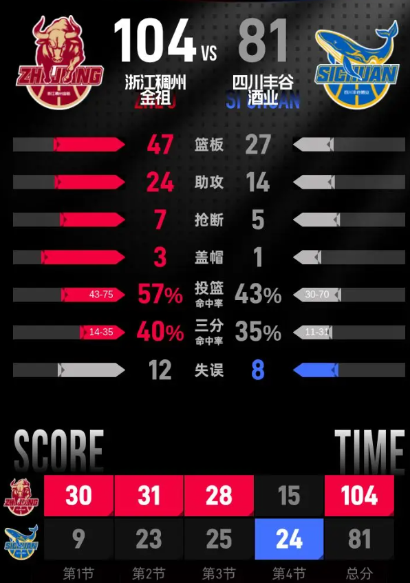 进入第四节,四川开局连得四分,维纳莱斯连续命中两记三分,景浩扬也命中三分,四川打出一波12-4的攻击波,将分差缩小到25分。浙江稳扎稳打控制局面,兰道夫两次篮下得分,李悦洲上篮得分,兰道夫命中三分后将比分拉到104分。四川末段冯小宇连续篮下得分,最终全场结束,浙江客场以104-81击败四川。