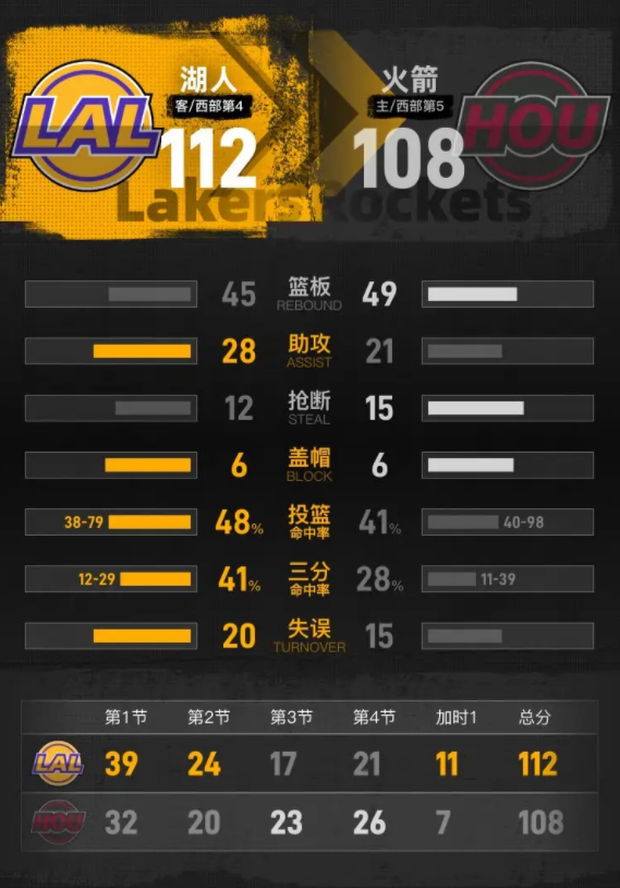 双方战至加时,斯马特开局命中三分,八村塁两罚全中后,湖人建立4分优势。申京两次内线命中紧咬比分,最后一分钟斯马特四罚全中,将分差拉大到6分。谢泼德命中三分缩小分差后,斯马特再罚中一球,最终湖人客场112-108击败火箭。