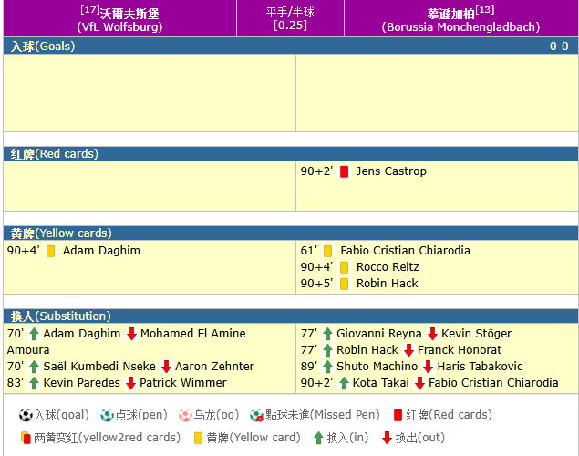 下半场补时第2分钟,门兴格拉德巴赫球队卡斯特罗普吃到红牌。最终比分沃尔夫斯堡 0-0 门兴格拉德巴赫。