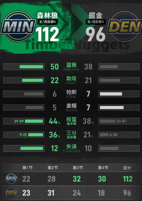 全场具体比分(森林狼队在后):23-22、31-28、24-32、18-30。