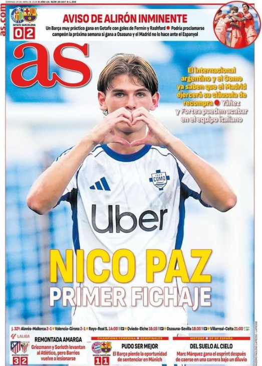 时间:2026-04-26 14:40:09本周日的《阿斯报》将尼科-帕斯放在了封面位置,报道称皇马将执行其在科莫手中的回购条款,他将成为皇马下赛季的“第一笔签约”。