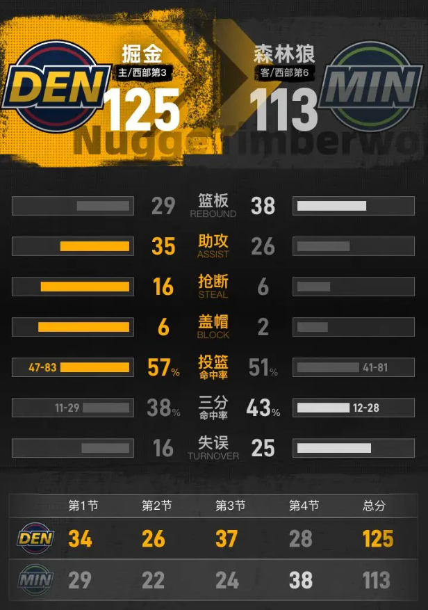 比赛进入末节,大比分落后的森林狼没有放弃,发起反扑攻势。兰德尔、多森姆连续突破得分,海兰德外线持续开火,打出一波16-6的进攻高潮,将分差缩小到15分。末节中段兰德尔带动队友连续得分,分差进一步缩小到10分,布朗和默里迅速回应得分,帮掘金重新拉开分差。香农末节后段连续拿分,森林狼将分差缩小到12分,约基奇最后时刻命中跳投,帮助掘金守住优势,主场125-113击败森林狼。