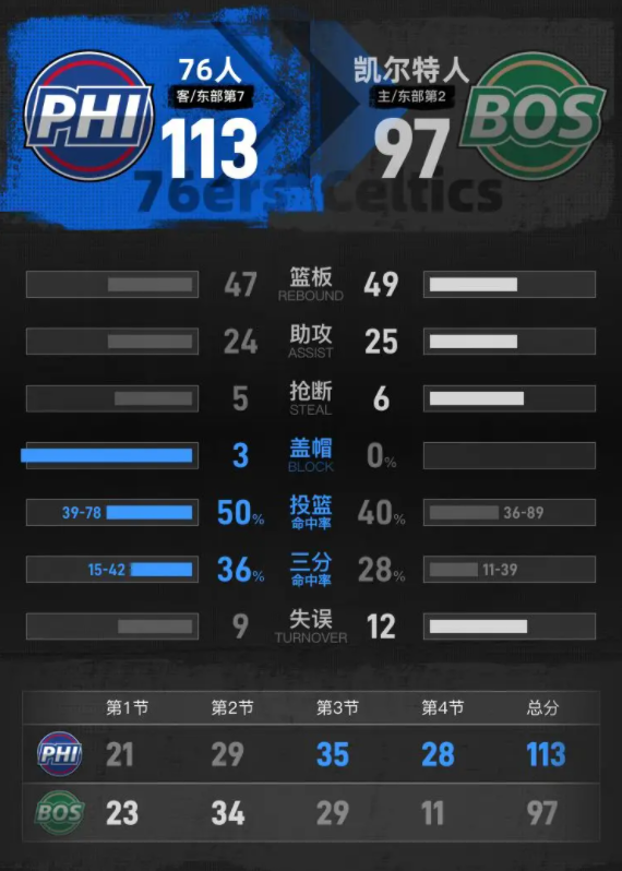 北京时间4月29日NBA季后赛,客场作战的76人以113-97击败凯尔特人。马克西25分10篮板5助攻,塔图姆24分16篮板4助攻。